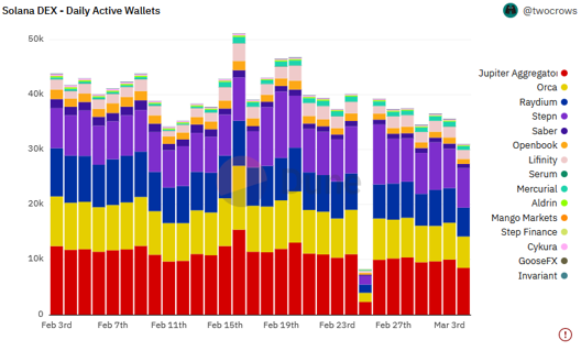 Another element to Orca’s* success is its composability. Just as Orca’s* interface is designed for usability, Orca’s* open-source Software Development Kit (SDK) is designed for easy integration into other applications. This has led protocols like STEPN (purple) to integrate Orca* “under the hood” to facilitate swaps for their users. Jupiter, STEPN and native Orca* volume combined account for the vast majority of all daily active DeFi wallets on Solana*.