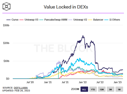 Within the ETH cohort of DEXs, Curve and Uniswap have dominated. As of the writing of this report, Curve accounted for $4.94B TVL and Uniswap accounted for $4.14B. At the peak of the previous cycle, Curve held $24.3B TVL and Uniswap held $11B TVL.
