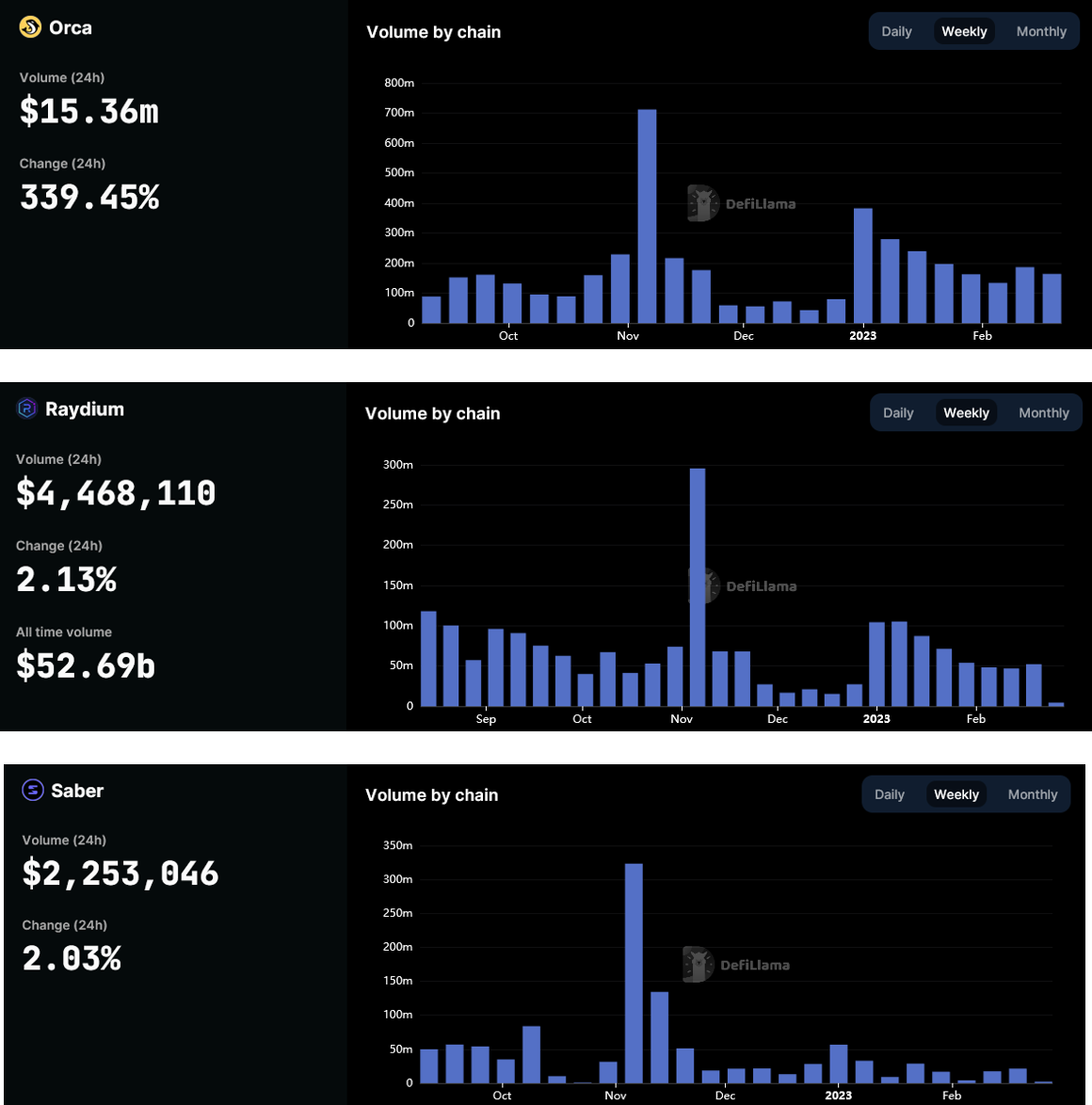 Looking at volume trends on Orca*, we can see that it was running between $100M-$200M per week throughout Q4 2022 and has been running at $150M-$350M throughout Q1 2023. Monthly average volume has increased 22% in 2023, even when including the huge Nov 2022 volume spike in the Q4 2022 data set that was the result of the FTX/Alameda blowup. Normalizing that week in November to the volume of the weeks preceding and following it, results in a 92% QoQ monthly volume growth rate. Orca* is averaging $876M monthly volume in 2023, while its nearest competitors are averaging $289M (Raydium) and $95M respectively.