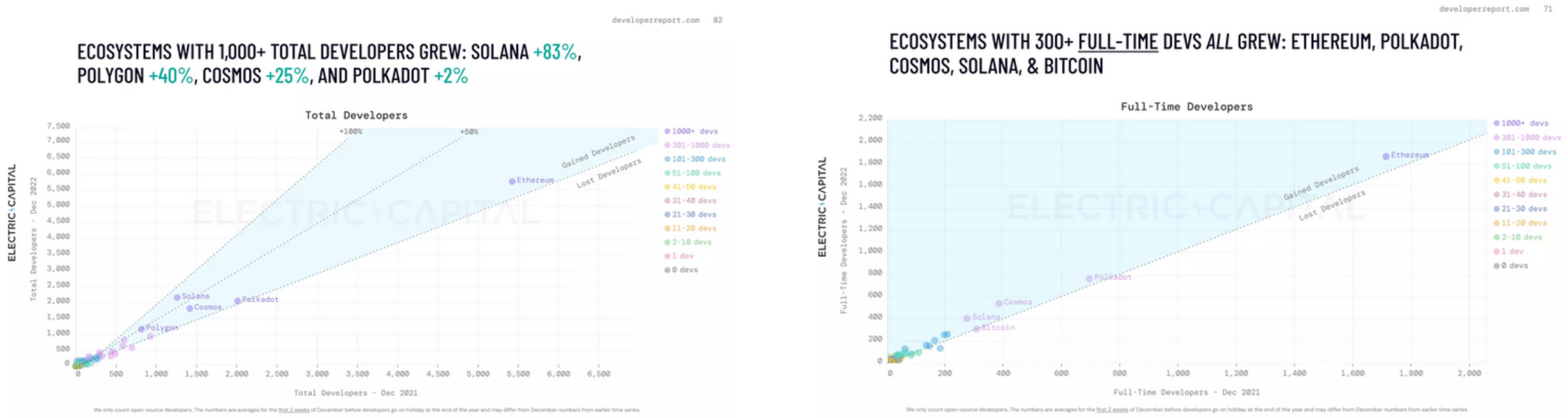 Now let’s look at the same data for 2022, a year that marked the bottom of the crypto cycle. In 2022, Web3 developer activity, as a whole, grew by 5% YoY. That doesn’t seem like a lot, but it’s quite impressive in an environment where prices declined 70% YoY. But the real story of 2022 was Solana’s* continued developer growth.