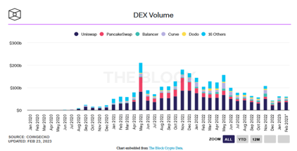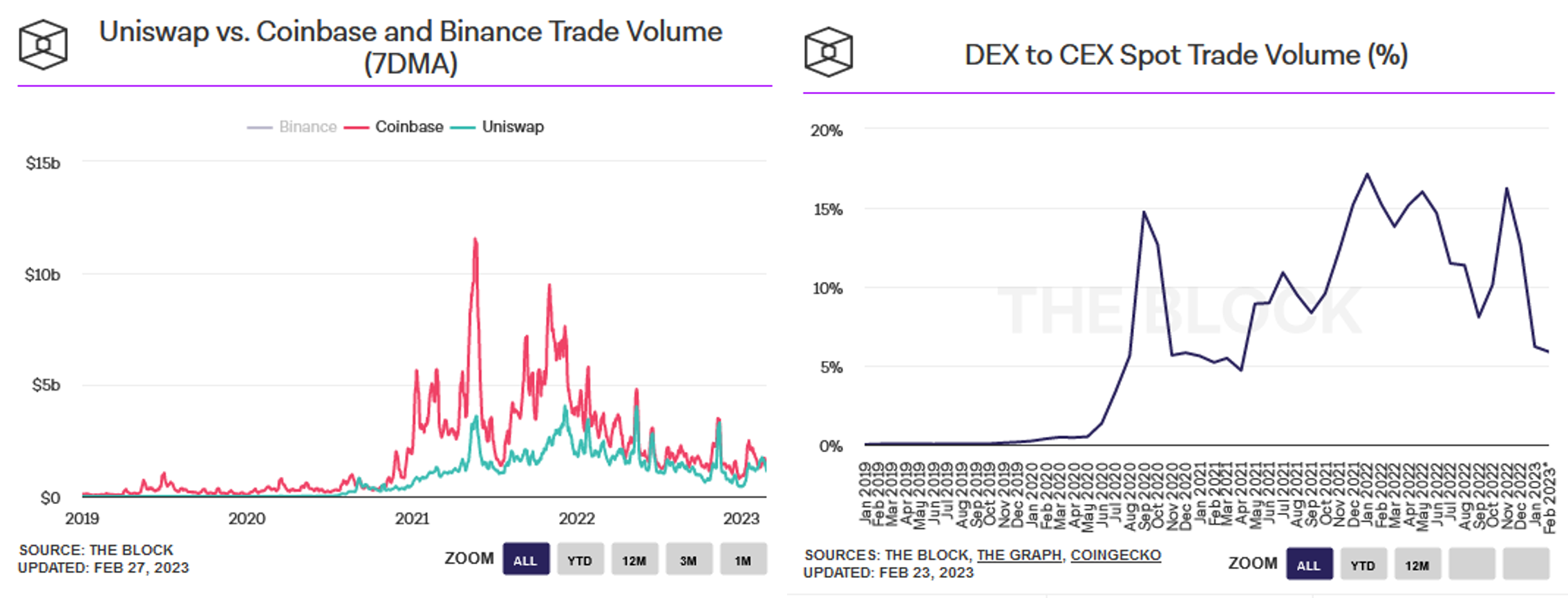 As of the writing on this report, Uniswap and Coinbase are essentially equivalent in terms of daily trade volume, with each clocking anywhere from $1B to $1.8B volume on any given day. Zooming out even further, we can see that, in aggregate, DEXs account for, on average, 10% of total crypto trading volume. In February 2023, total DEX spot volume was $59.83B and accounted for 5.87% of total crypto spot trading volume, which was just over $1T for the month. Using today’s BTC spot to futures volume as a proxy (a ratio has been relatively consistent), where futures volume is roughly equivalent to spot volume, we can double the spot volume number to arrive at total volume of $2T per month. CoinGecko 24h total exchange volume data, including spot and futures, confirms this, showing 24h combined CEX and DEX volume of $70B, or $2T on a monthly basis. Annualized, this means we’re looking at $12T in spot market volume and $24T in total market volume. Impressive numbers near the bottom of the cycle. For context, annualized US equity market volume runs at approximately $125T as of the writing of this report, and annualized global equity market volume was approximately $168T in 2021.