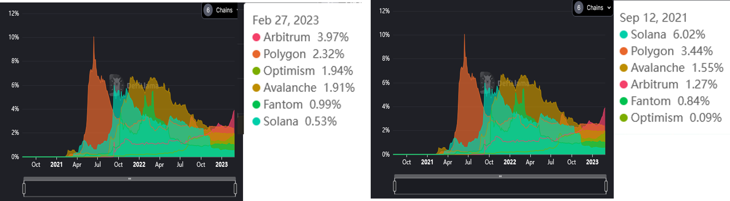 Zooming in further, excluding ETH L1, we can see that the DeFi market is very fragmented. As of today, Solana* accounts for only 0.53% of aggregate TVL. However, this was not always the case. Prior to the FTX implosion, DeFi on Solana* was the clear, ETH-excluded, market leader accounting for 6% of all TVL. Looking back, we now know that DeFi on Solana* during that period was heavily imbalanced to favor Alameda Research, the hedge fund of FTX founder Sam Bankman-Fried. Thus, Solana* was experiencing significant DeFi growth, despite the predatory practices of a significant bad actor in the ecosystem. The decline in market share over the past six months is the result of FTX/Alameda fallout. We believe this is a blessing in disguise.