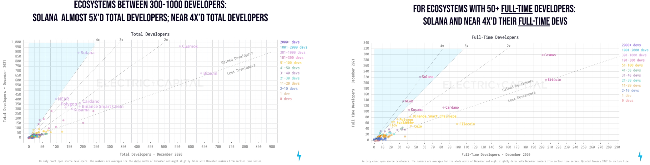 This is where Solana* really shines. First, let’s look at 2021 because it was a big year in terms of onboarding Web3 developers regardless of chain. In 2021 Solana* was the only Layer-1 platform to nearly 5x the number of developers building on its platform. We see this same trend play out with regard to full time developers. In a year that most chains experienced significant developer growth, Solana* stands out as the clear winner.