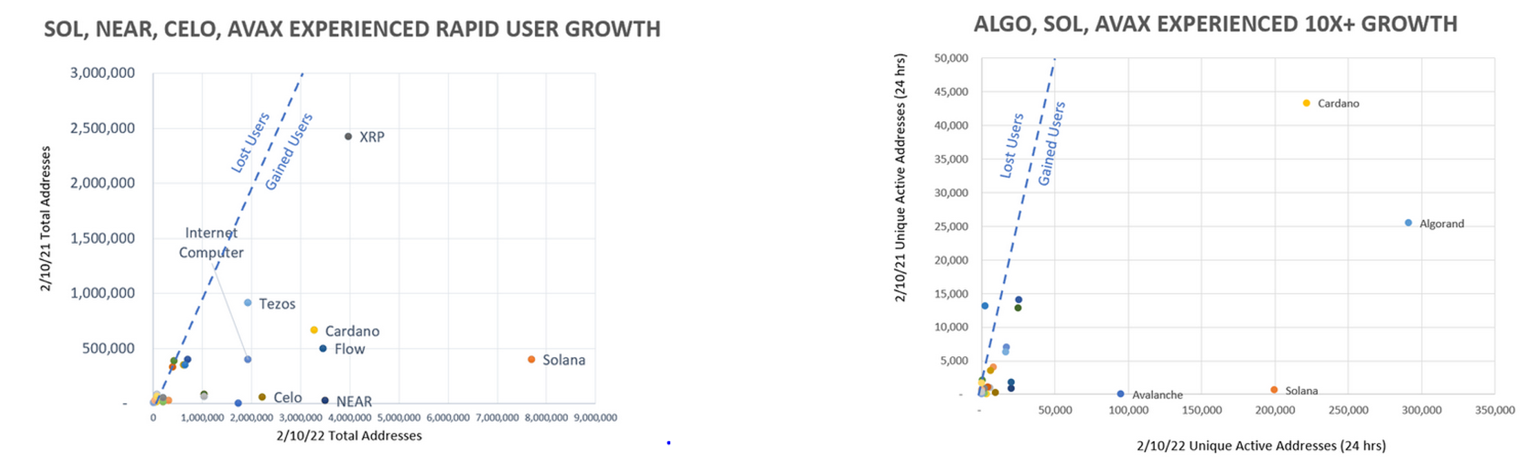 The next prerequisite is users. Web3 user data, when combined with Web3 developer data, gives us a more complete picture of where Web3 network effects are accruing, and where healthy ecosystems are emerging. Again, Solana* really shines here in terms of rapid growth. Looking at the 2021 data, Solana* started the year with 500,000 total user addresses and ended the year with nearly 8-million.